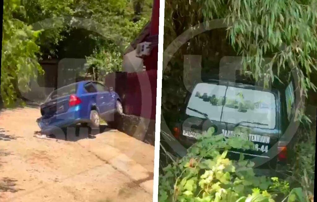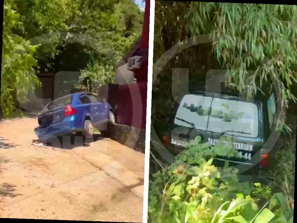 В результате угонщик, вероятно, потерял управление и угодил в кювет — его внедорожник остановился в кустах всего в нескольких метрах от разбитой машины.