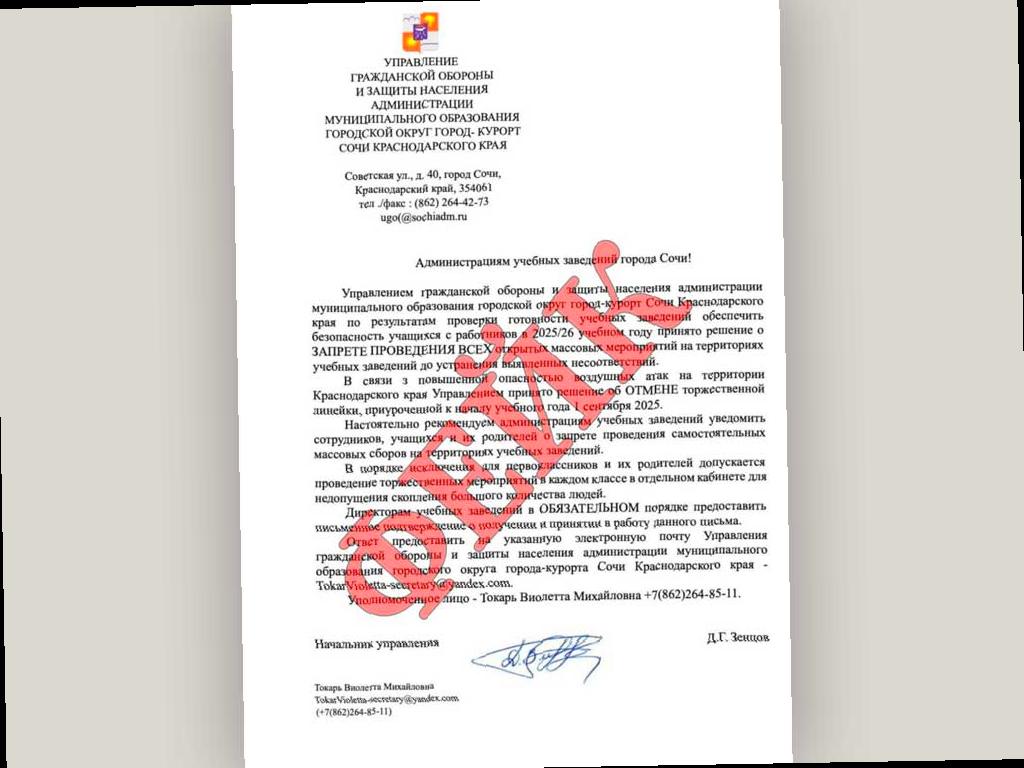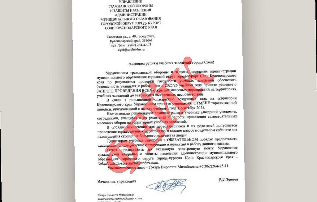 В соцсетях появилось фальшивое уведомление о том, что открытые массовые мероприятия будут отменены к началу учебного года. Документ, якобы изданный управлением гражданской обороны и защиты населения администрации Сочи, вызвал обеспокоенность.