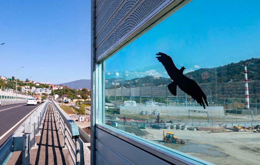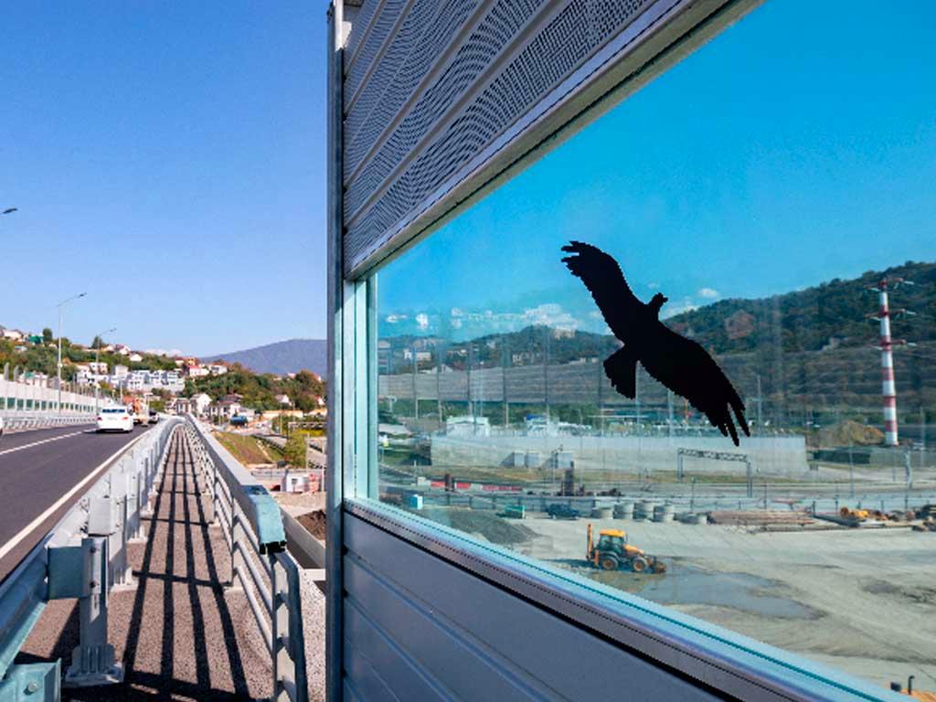 На Обходе Адлера специалисты ГК «Автодор» нанесли на шумозащитные экраны силуэты хищных птиц. Такой необычный способ защиты выбран для предотвращения столкновений мелких птиц с прозрачными экранами, которые они не замечают и могут разбиваться о них.