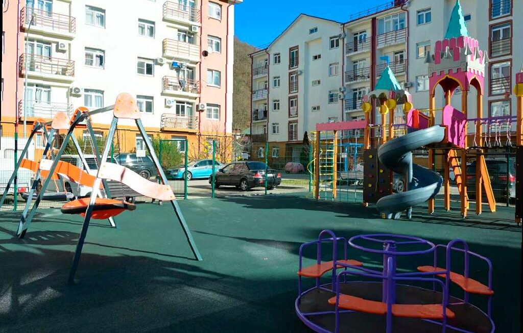 Спортивная зона предназначена для игры в футбол, волейбол и баскетбол. Здесь установлены тренажеры, спортивный комплекс и оборудование для настольного тенниса. На детской площадке разместили игровые комплексы и карусели. Парковая мебель и уличное освещение также будут установлены на прилегающей территории.