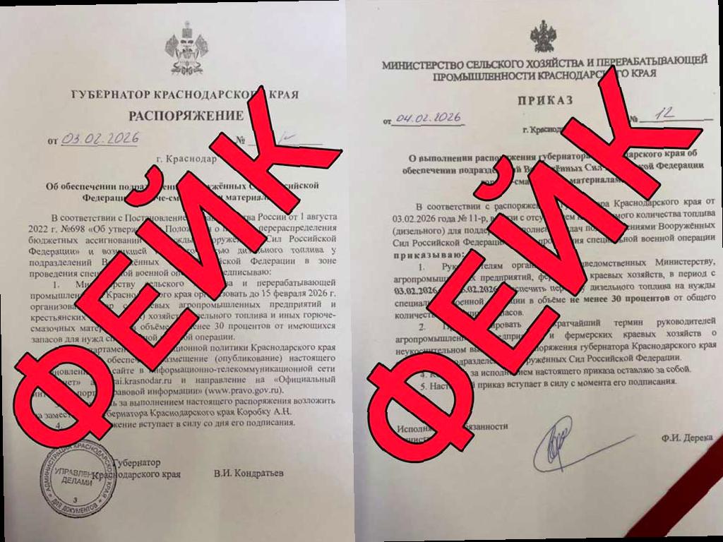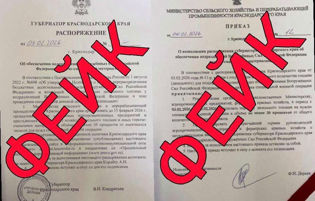 В последнее время в СМИ и соцсетях появились два документа, которые якобы свидетельствуют о том, что аграрии Кубани должны передать часть топлива на нужды Вооруженных Сил России. Однако оперштаб подтверждает, что эти документы являются грубой подделкой и не имеют отношения к официальным органам власти.